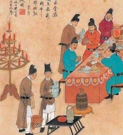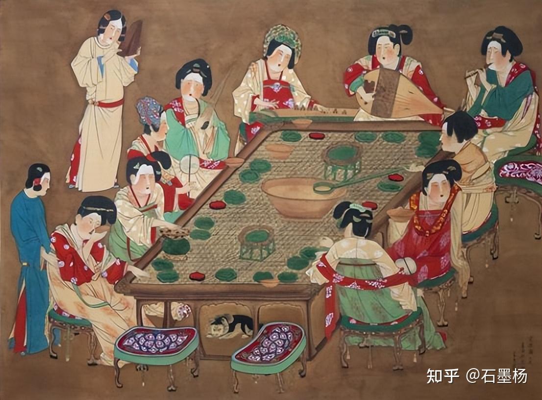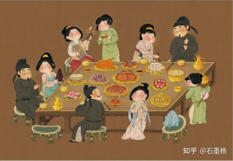 唐人请客吃饭,不是现在的大圆桌,菜齐了,一起举筷子吃。唐人吃饭都是一人一份,并不在大桌子上一起吃。可以参考南唐顾闳中的著名的《韩熙载夜宴图》,南唐距离唐代并不远,依然保留了唐代的衣着和饮食习惯。