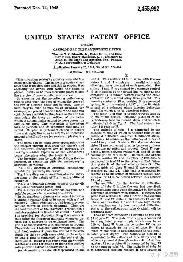 《阴极射线管娱乐装置》作为第一个记载史册的游戏机,是个用八个真空管模拟导弹互相攻击的游戏机注册送彩金的平台。由Thomas T.Goldsmith Jr.和Estle RayMann申请专利。游戏装置没有对外行销或销售。。