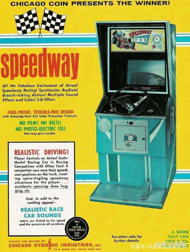芝加哥投币游戏机制造公司(Chicago Coin)生产的《赛道》(Speedway)游戏推出,其赛车游戏采用视觉显示和电子音效技术,在玩家体验上再做突破。