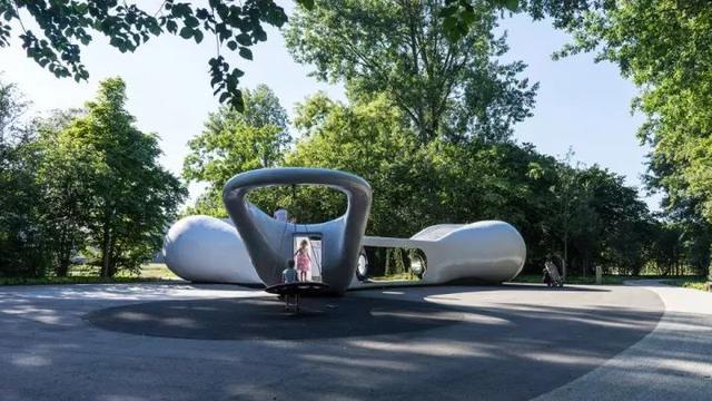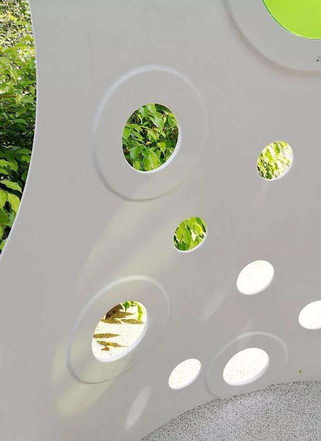 为了实现各种功能需要,该装置被分解成三个区域,并重新定义了其周围环境。装置一边一面完整的镜子,反射了周围的绿色。走近看,儿童游乐的身躯和路人的身影在镜面的映射下变得扭曲而有趣。设计在装置的第二个内凹处,置入了一个巨大的蹦床。第三个内凹处的球门,作为儿童游乐场的延展部分。而在装置末尾处的翘起部分,设计师加入了一个摇摆部件。装置最终创建了一个全方位的游戏空间,使孩子们可以在其四周及内部等各个地方玩耍。