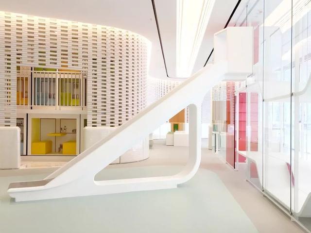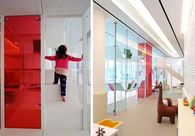 室内游乐场里最引人注目的是一个长长的透明书柜,仿佛一堵墙,挡在走廊和游乐区之间。它不仅仅是一个书柜,还是一个垂直游乐设施。粉色的有机玻璃板,小楼梯,和平台,为孩子们在两面玻璃墙之间创造了一个隐秘的游乐阅读角。孩子们还可以从高处坐白色滑梯滑下来。