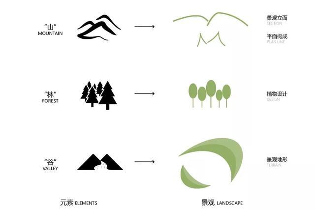 项目所在地位于北国森林之城长春,这里山谷纵横,森林繁茂。繁茂优美的自然环境成为我们的设计灵感来源,我们从自然的山林谷底森林丘壑中寻找空间氛围,提炼设计语言,凝练为“山林谷”,通过平面和立面上的构成,对场地局部进行半包围围合,打造山林谷地的穿越性峡谷空间意味。