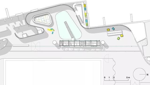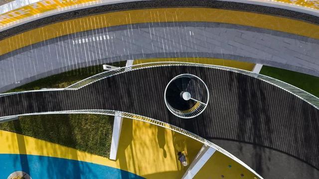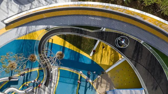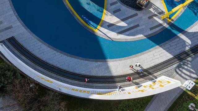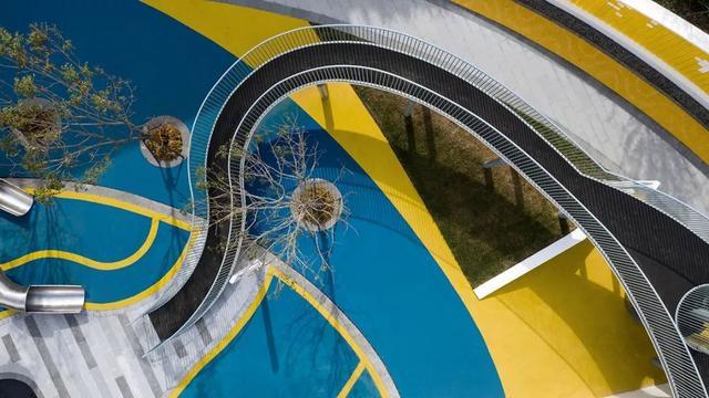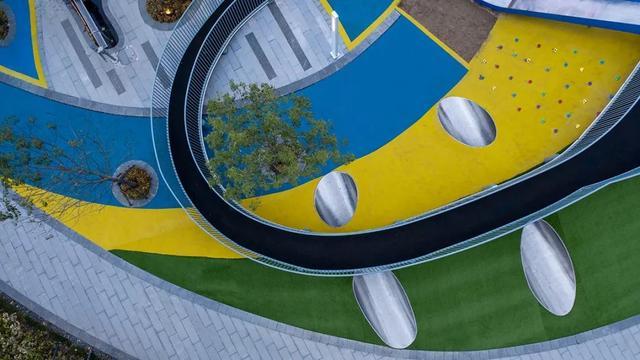 优雅的椭圆和自由曲线环绕重组,精心布局,引导路径,形成界面,形成功能性的综合场地。蓝色与黄色的EPDM塑胶地垫拼贴组合,创设出几何化场地,容纳安放趣味和想象。