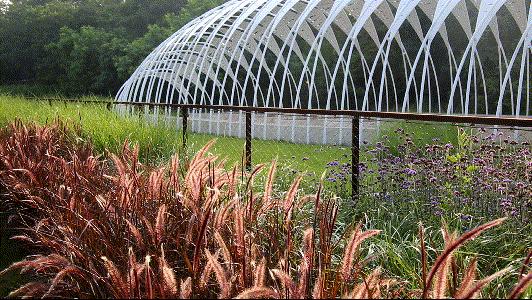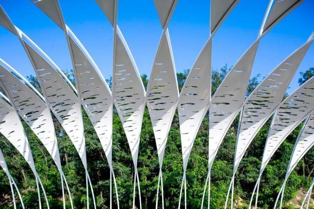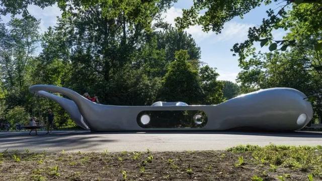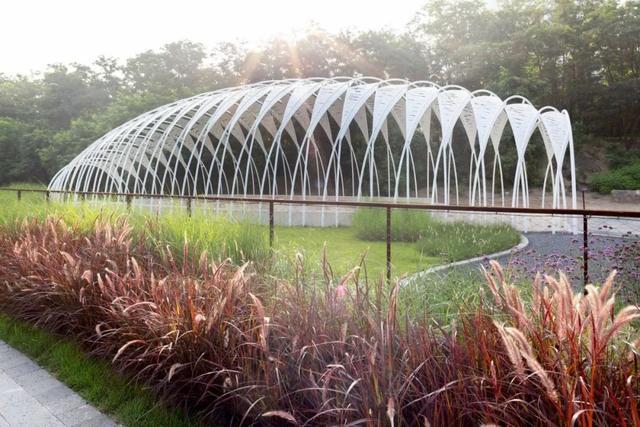 尽管该装置隐匿于树林之中,它淡紫色的外表光泽和特别的形态创造了一个地标式的公园景观,让这座古老的公园焕然新生。