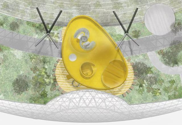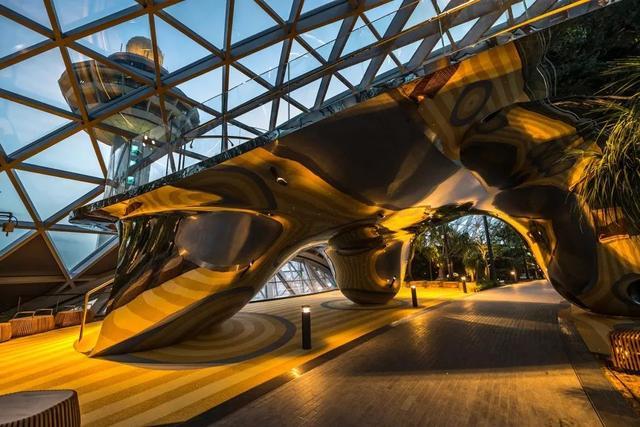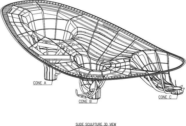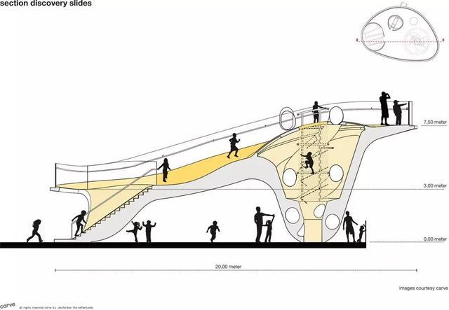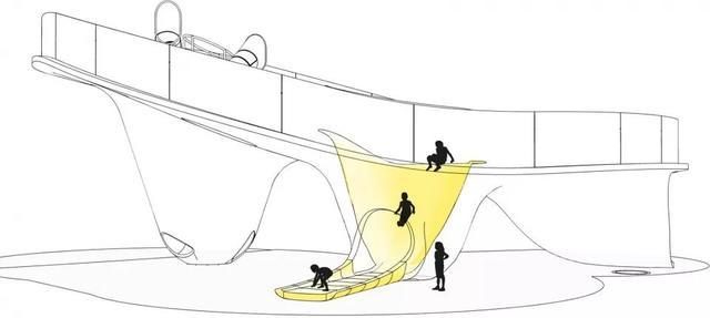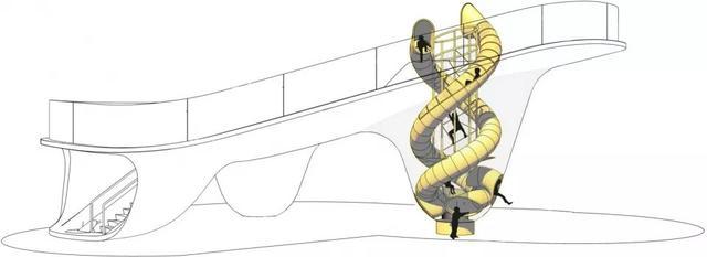 亮黄色雕塑内部包括四个滑梯:一道家庭滑梯,一个陡峭下降滑梯和两个从最高处滑落的玻璃螺旋滑道。探索滑梯雕塑拥有双曲线形态的钢外壳。曲线玻璃在观景台用作栏板,在从最高处滑下的双螺旋滑道处用作包裹外壳。光纤灯集中在雕塑周围的橡胶地面上,点状灯安装在最高处的圆锥体上,led灯光带位于曲线玻璃栏杆的边缘。雕塑观景台上也使用了空调系统,当孩子们在紧靠屋顶下的滑梯上玩耍时,可以有一个舒适的温度。