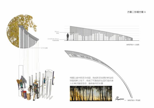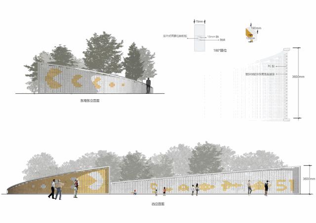 环抱场地的围合景墙,我们希望不仅仅放置一面阻挡视线的隔墙,而通过互动的方式,激活场地边缘活力,增强可参与性。经过多方面的景墙设计探索之后,采用了翻版景墙的方式。
