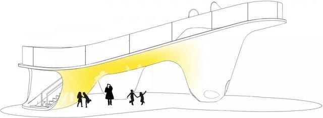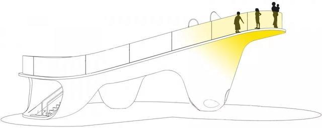 ▼一个连续光滑的抛光钢材表面包裹着容纳了大通道平台的三个圆锥体