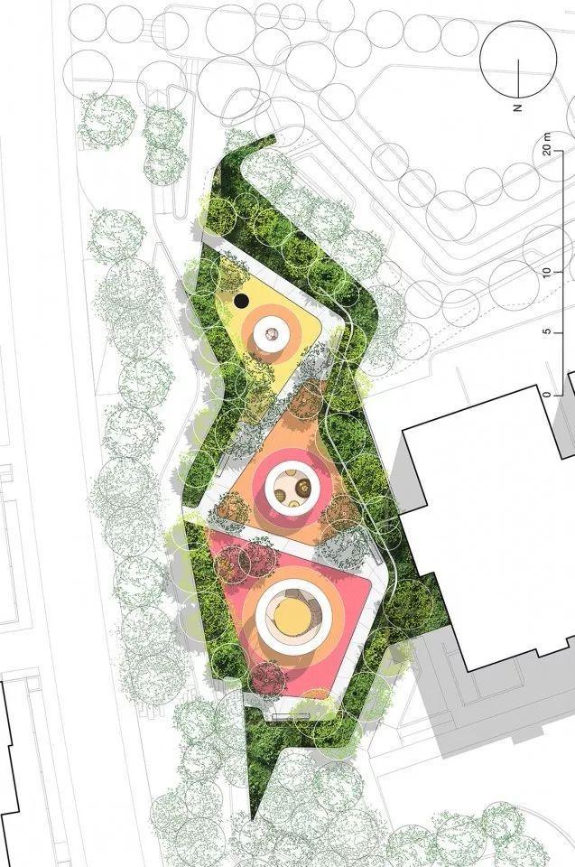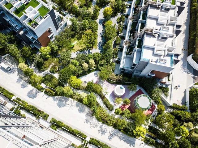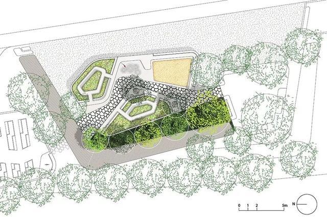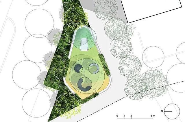 乐园局部,小像素的绿色植物围绕在广场周围以提供私密性和安全屏障