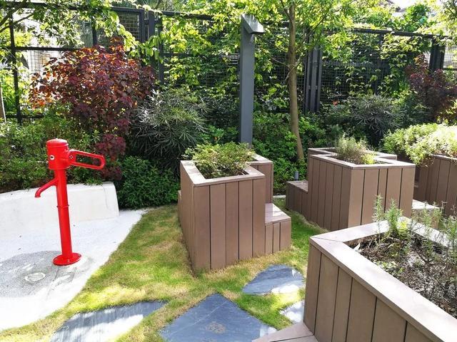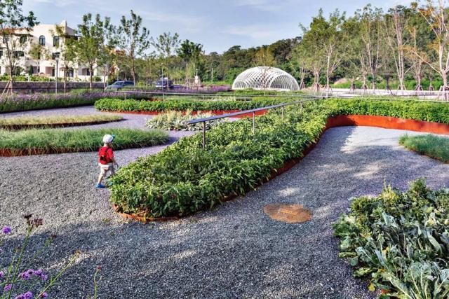 菜园,也叫城市农场,由四个区域组成,四个区域通过小径彼此相连,每个区域都有自己独特的功能。第一个区域是自行车停放处,然后是摆满花槽的第二个区域。再往前走是第三个区域——教学区,里面有长凳和综合药草园,孩子们可以在小沙坑里游戏或者玩水。最后一个区域是关于“食物和社区”的。这是一个比较私密的空间,小区住户可以在这儿会面,开个烧烤party。