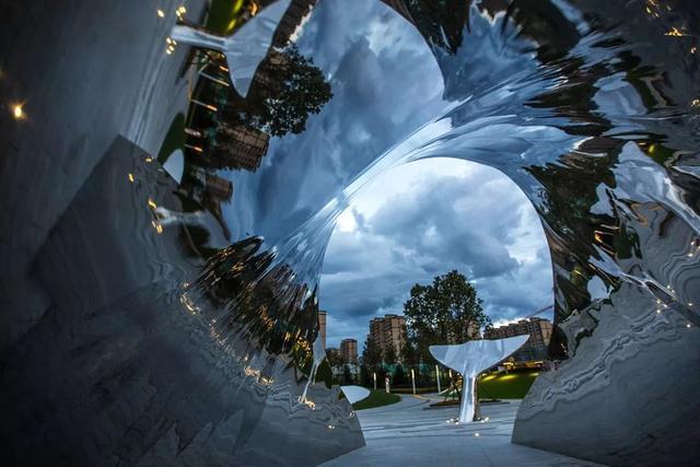 随着脚步和视线的移动,游人才会渐渐察觉到,此为一个巨型的鲸鱼雕塑。奇幻的美好和奇妙的幸福在此展开。镜面不锈钢的鱼身可以放大或缩小四周万物的变幻及每个人的欢颜,雾喷奇景可以唤起每个人的遐想,大家都能在与鲸鱼的互动中得到美好与欢愉。