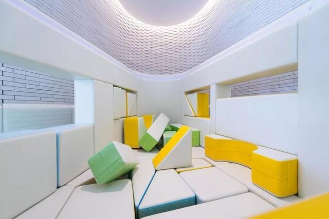 最后是位于会所内部深处的室内游乐场。Carve团队设计了游乐场的室内部分。会所内部看起来非常整洁,有许多玻璃墙面,曲折的砖墙,和中庭。设计师以后墙的流线造型为设计出发点,营造出一种效果——玻璃墙面把空间包围起来,将室内游乐区和会所大厅区分开。设计师在有限的空间里设计了一个和会所风格一致的游乐区,里面有图书馆,书架,读书角,一个真人比例的娃娃屋,还有一个游戏屋。游戏屋里的地上和窗户上有很多可拆卸的软积木。孩子们可以用不同的方式来组装,创造他们自己的“建筑”。屋里的黑板能让孩子们尽情发挥他们的想象力。