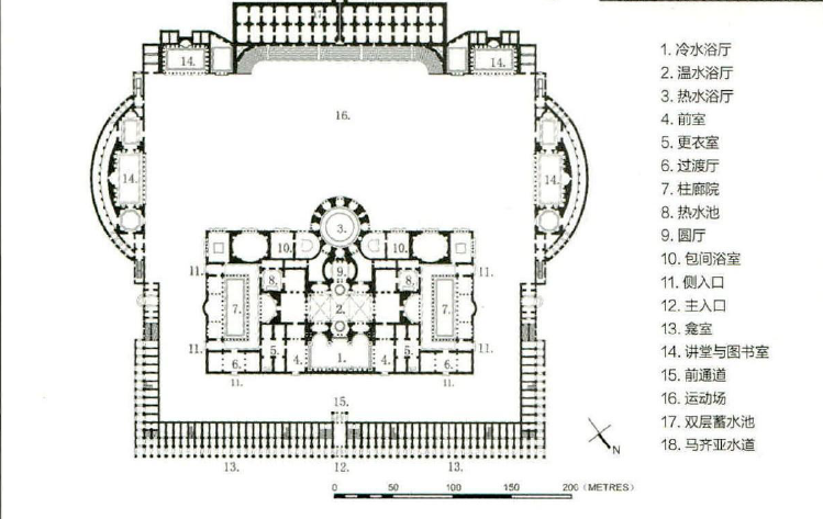 以卡拉卡拉浴场为例,它是一个严谨的中轴对称的空间序列。浴场周边是沿街店铺、演讲厅、图书馆等建筑物,后部是运动场、看台和水库。