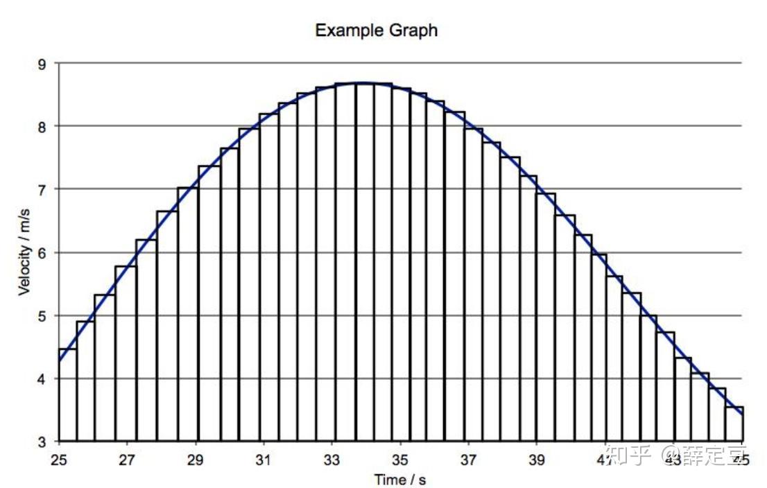 微积分里我们学到,定积分(也就是曲线下的面积)可以想象成很多等宽小矩形加起来的面积之和,如下图所示,