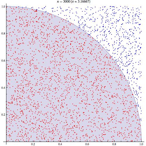 如果(x,y)是独立地从0到1之间均匀分布抽样出的一系列的数对number pair, 那么这些随机的位置坐标(x,y)落在1为半径圆弧内的概率应该是:四分之一圆的面积➗整个正方形的面积: